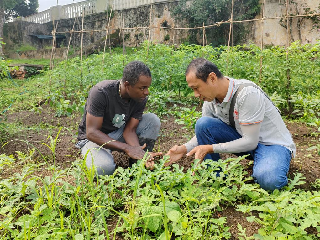 中国援圣普农牧业技术项目组专家彭杰(右)在圣多美和普林西比的梅佐希大区指导蔬菜种植户改善田间管理技术(2024年1月25日摄)。新华社发(中国援圣普农技组供图)