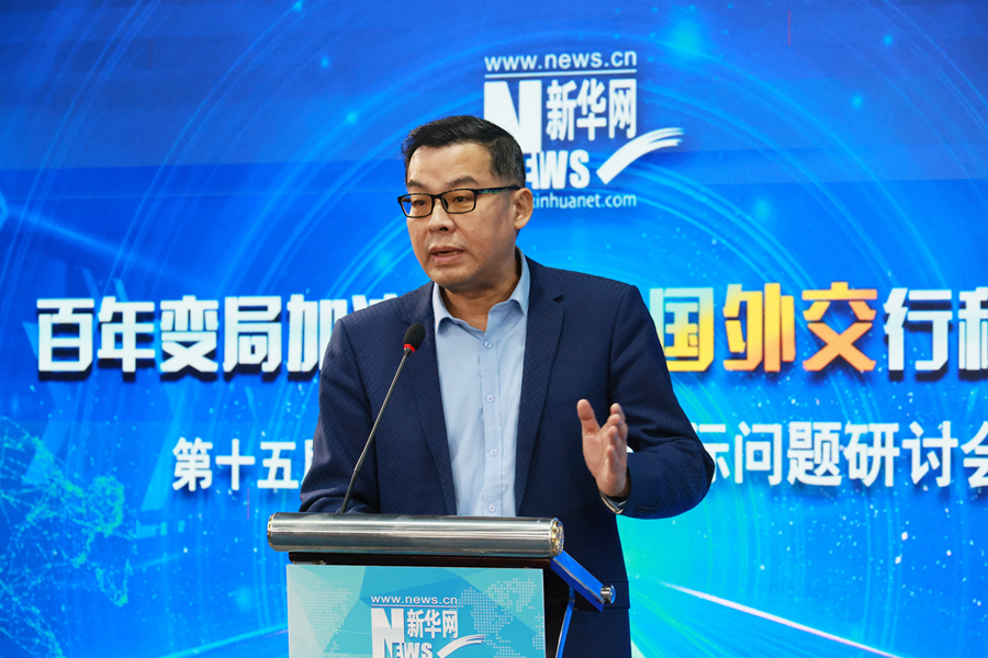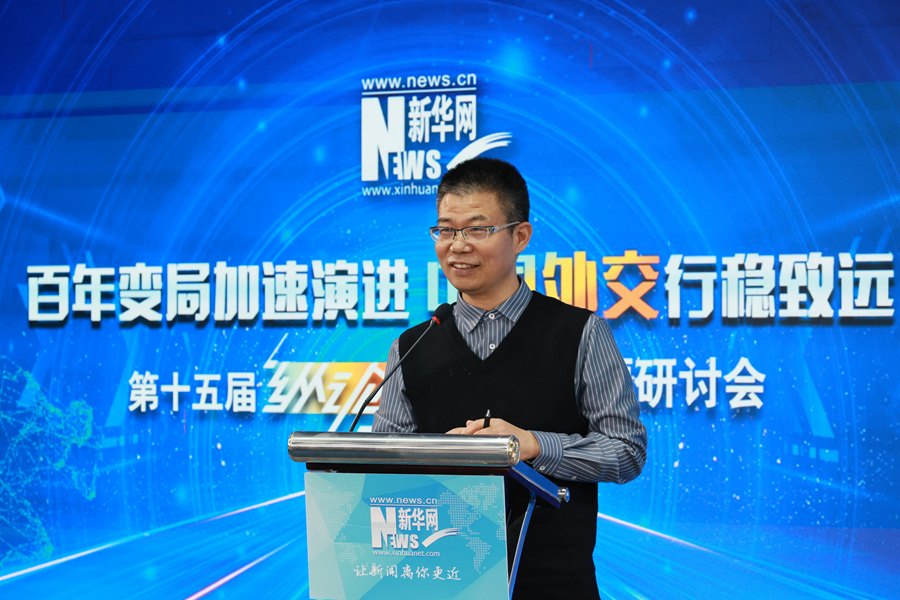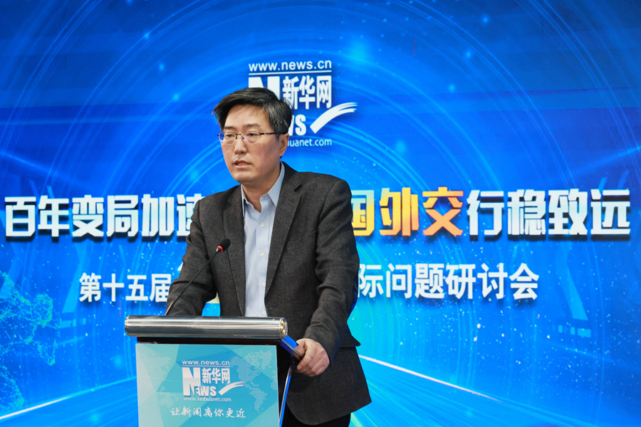 1月2日,新华网第十五届“纵论天下”国际问题研讨会在北京新华网总部举办。图为中国社会科学院亚太与全球战略研究院政治室主任董向荣在进行下半场主题演讲。新华网 杨霁昕 摄