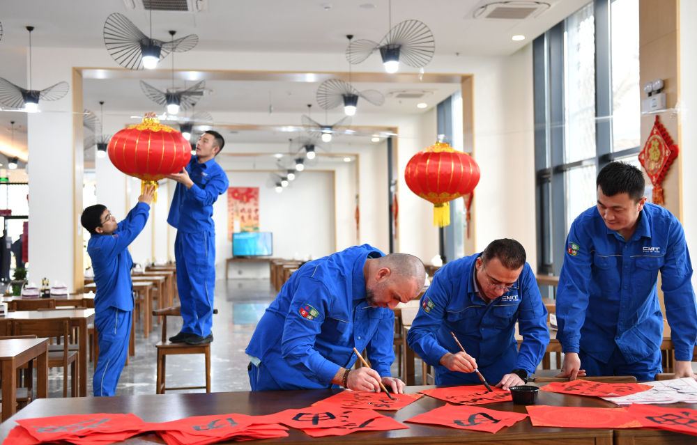 1月23日,在伊拉克米桑油田,中海石油伊拉克有限公司中外员工一起写春联,挂灯笼。新华社发(中国海油中东区域供图)