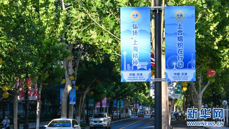 这是8月25日在天津中心城区拍摄的街景。随着峰会日益临近,天津街头巷尾的“上合元素”悄然增多,迎接盛会的氛围日益浓厚。新华社记者 孙凡越 摄