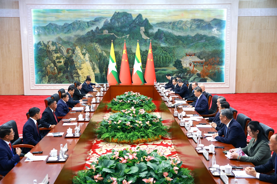 8月30日下午,国家主席习近平在天津迎宾馆会见来华出席2025年上海合作组织峰会和纪念中国人民抗日战争暨世界反法西斯战争胜利80周年活动的缅甸代总统敏昂莱。新华社记者 翟健岚 摄