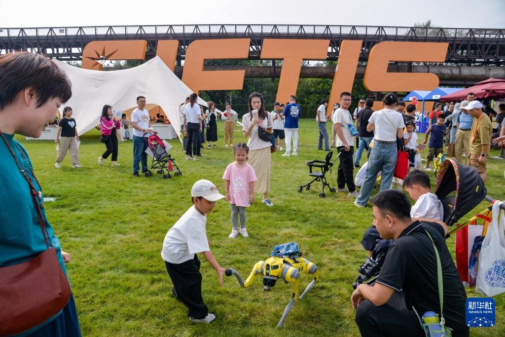 9月13日,在北京首钢园,小朋友在2025年服贸会文旅服务户外展区与AI具身智能机器人“AI小蚂ROBOT”互动。