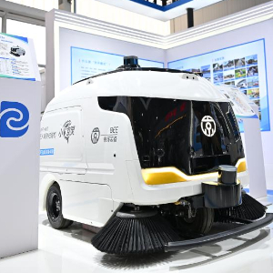 9月12日,一名参观者在服贸会北京环卫集团展台观看一款智能清扫机器人。