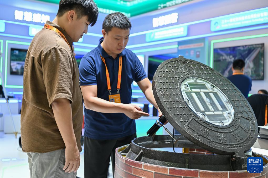 9月12日,参观者在服贸会上了解诺成新科技公司展出的太阳能智慧井盖,井盖集成光伏充电板、可充电锂电池组、物联网数据采集模块、传感器于一体,可实时监测燃气、自来水、排水管等管网,及时发现故障隐患,保障安全运行。