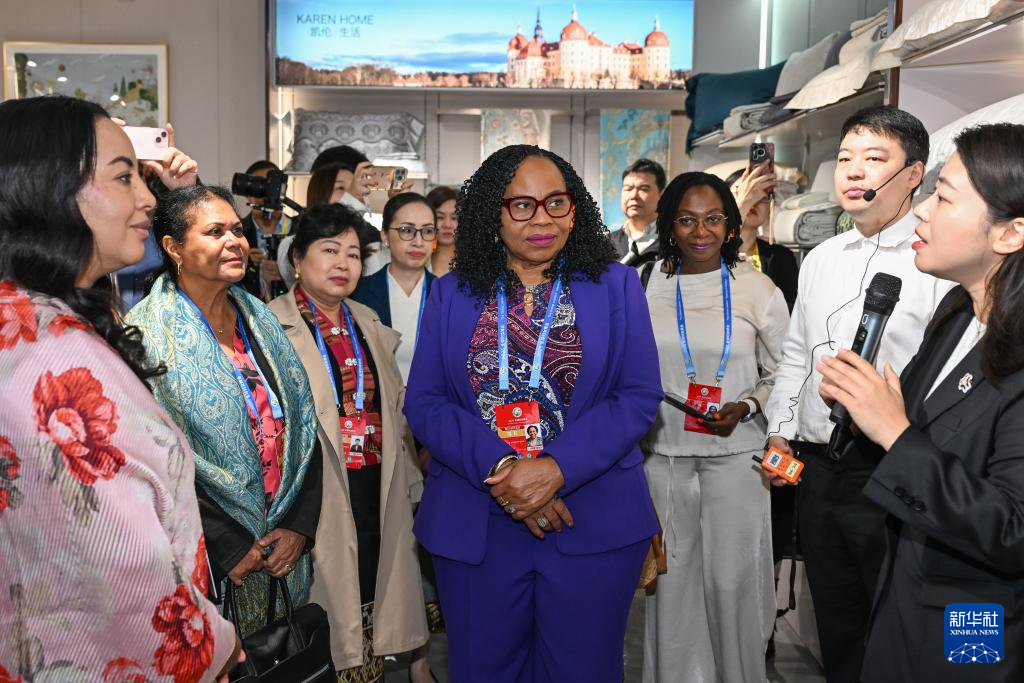 10月14日,全球妇女峰会参会嘉宾在北京市秀水街大厦参访。这是嘉宾观看电商直播。