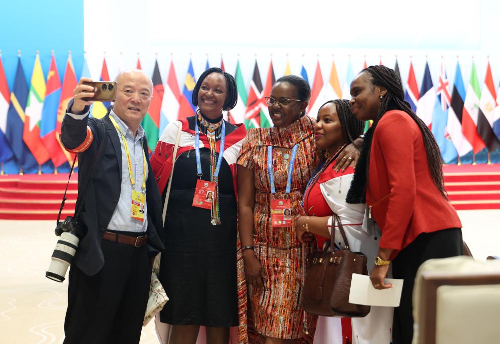 “多拍几张!”来自肯尼亚的代表在旗帜前举着手机拍了不少纪念照,又让记者帮着她们拍。其中一位代表告诉我,这是她第二次来中国,感觉中国又有新的变化,希望两国在妇女发展上多交流。