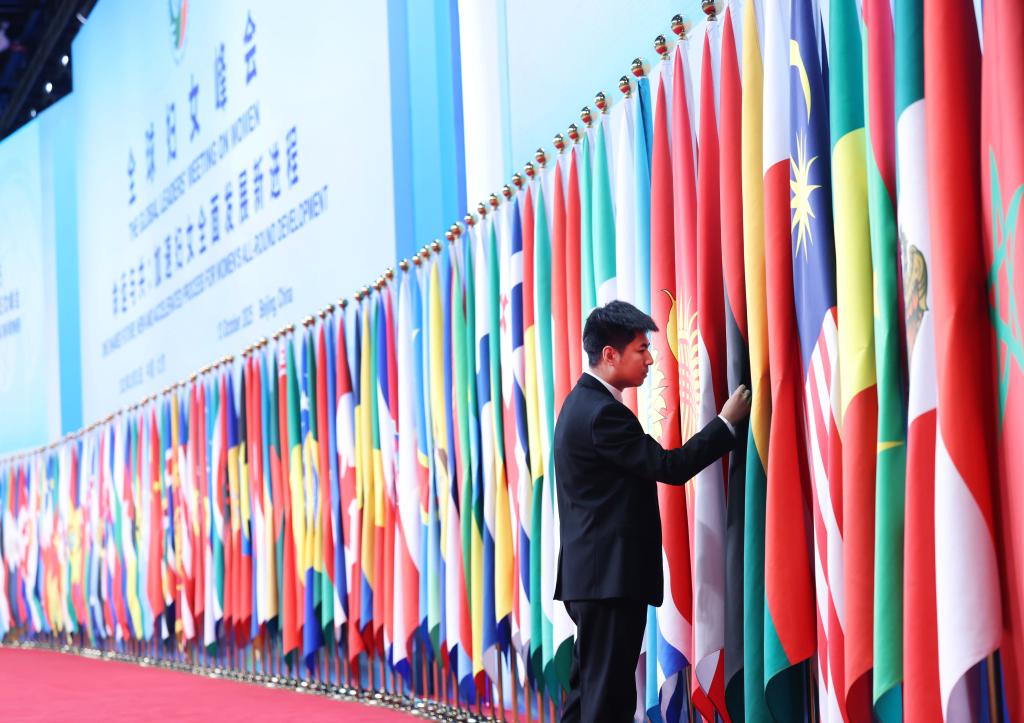 2025年10月13日,全球妇女峰会开幕前,工作人员仔细摆好各国国旗。