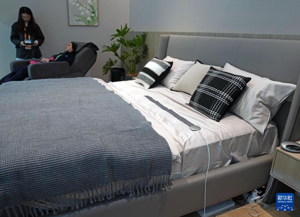 11月7日拍摄的在进博会消费品展区展示的适合老年人的智能调控卧室系统。床上的睡眠传感器通过感应和收集睡眠情况,自动调节房间光线、电动床、空调、空气净化机等设备,提升睡眠质量,加强起居安全。