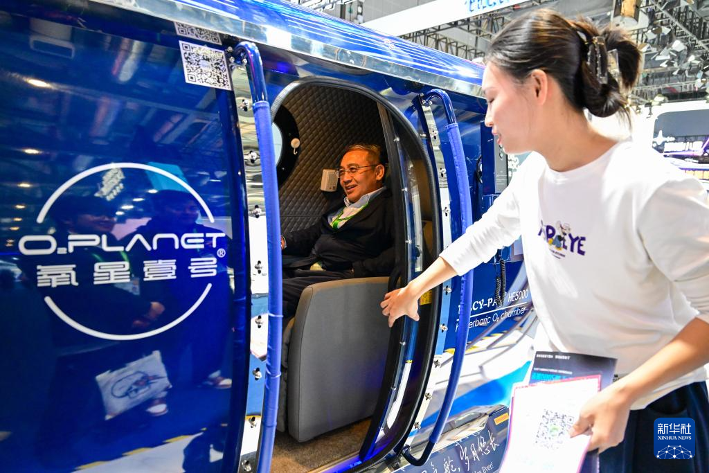 11月7日,在进博会医疗器械及医药保健展区,一名观众体验一款适用于中老年群体的家用高氧舱。