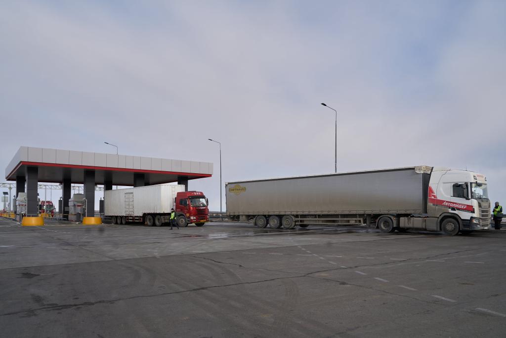 3月21日,在俄罗斯远东城市布拉戈维申斯克,货车在黑河-布拉戈维申斯克公路桥上的边境口岸等待出关。新华社发(郭飞洲摄)