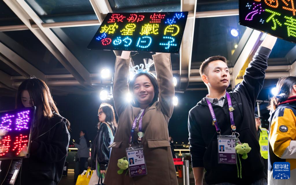 11月10日,在国家会展中心(上海)举行的第八届进博会志愿者离园仪式上,工作人员举着灯牌送别“小叶子”。
