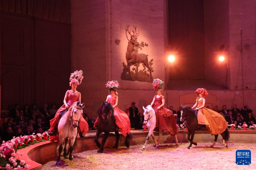 这是2月11日在法国上法兰西大区尚蒂伊城堡庄园举行的一场以马术表演为特色的马年新春晚会。新华社记者 张百慧 摄