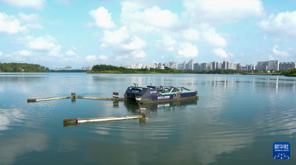 水上智慧环卫无人清洁船在万泉河水面作业(3月25日摄)。