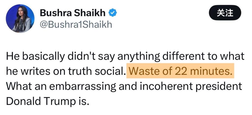 ——英国电视评论员布什拉·谢赫:这场讲话“白白浪费了我们22分钟”。