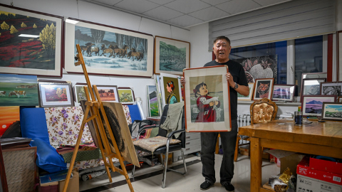 在內蒙古自治區扎魯特旗版畫院,放下牧鞭的照那木拉握緊刻刀,精心創作。家鄉草原的四季輪回化作精美的藝術品,遠銷各地,每年為他帶來10萬元的收入。