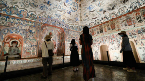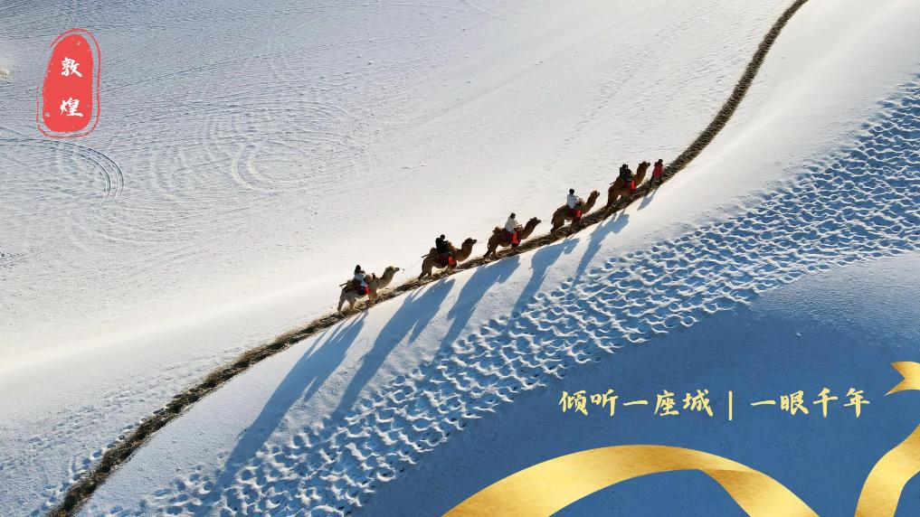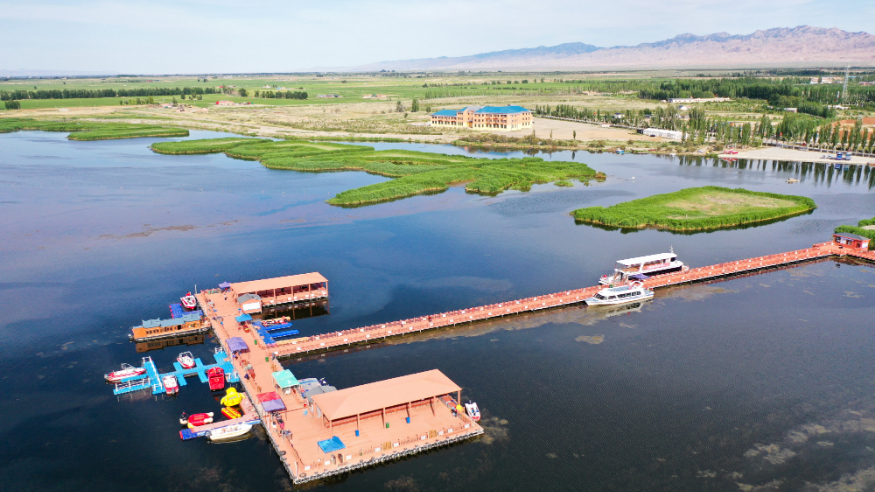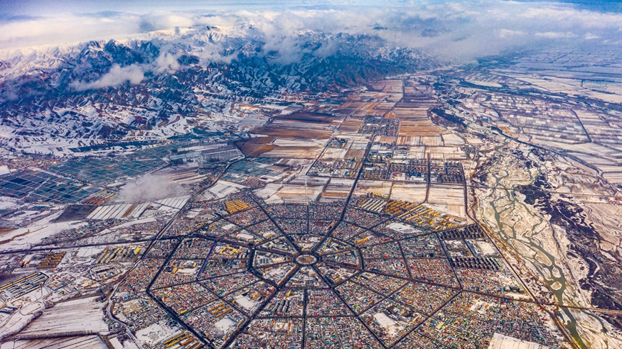 乘飛機(jī)從甘肅省會(huì)蘭州往西飛行約兩個(gè)小時(shí)后,茫茫戈壁上一個(gè)綠色小點(diǎn)出現(xiàn)在視線里。隨著飛機(jī)高度下降,俯瞰下去,一片多邊形的綠洲逐漸顯現(xiàn),如一塊美麗寶石。